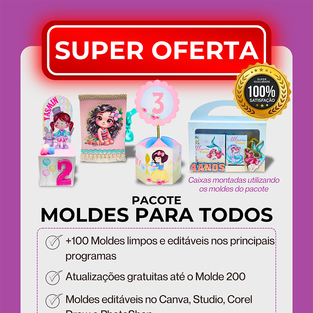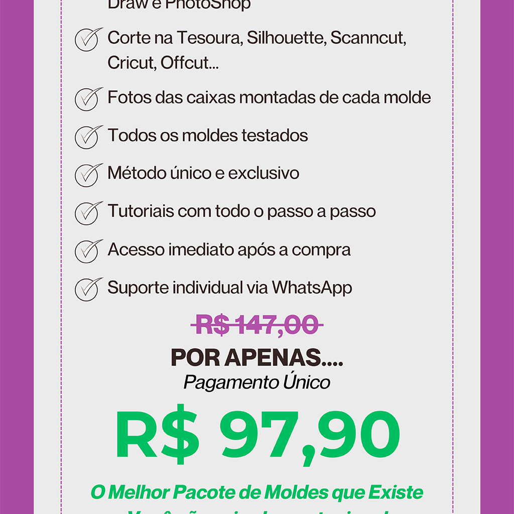 Se você é tesourete e usa o Canva, você vai amar a possibilidade de alterar as cores das linhas de corte e vinco com apenas um clique. Isso significa um acabamento impecável e profissional, sem aquelas linhas pretas que deixam o personalizado com um aspecto amador. E tem mais! Além dos moldes otimizados para recorte manual, você também já terá acesso aos arquivos para máquinas de corte. Assim, quando decidir investir em uma, não precisará comprar um novo pacote de moldes – você já terá tudo pronto para usar!